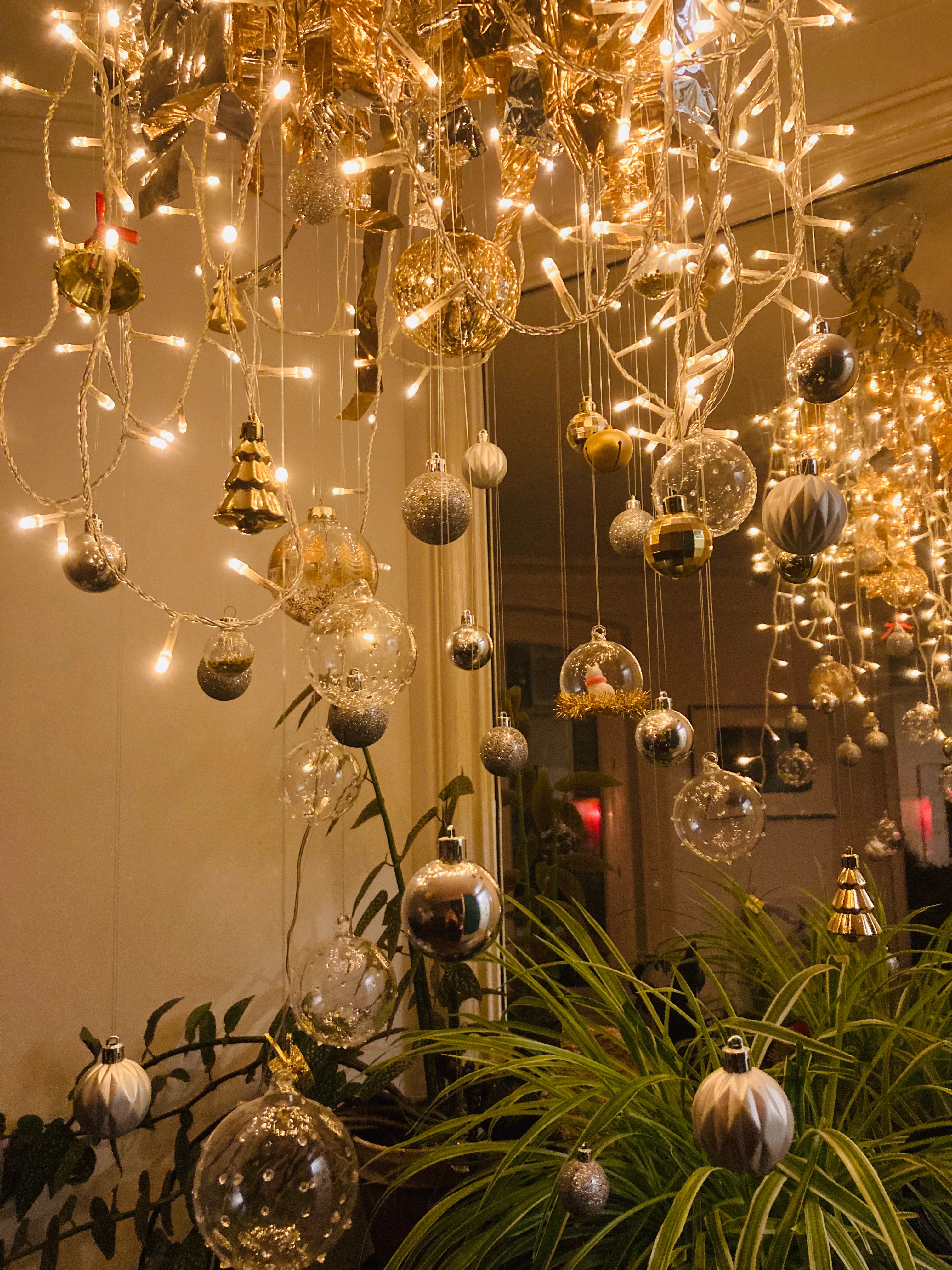 J’ai dit à Garance que je réfléchissais à un « air-sapin », elle m’a posé quelques questions sur la façon dont je l’envisageais, et quelques mois après elle débarquait les bras chargés de la structure de suspension lumineuse de sa propre cuisine, qu’elle avait décorée de larges rubans de couverture de survie.